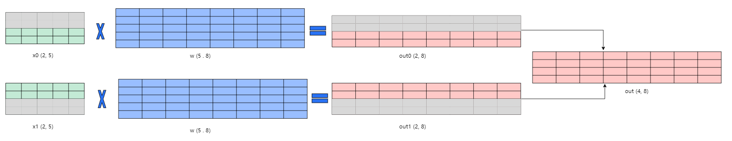 这样,在两台设备上,分别得到的输出,都只是逻辑上输出的一半(形状为 ),将两个设备上的输出拼接到一起,才能得到逻辑上完整的输出。