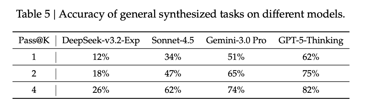 - 结论:这证明了合成数据包含的智能体任务对于现有顶尖模型来说依然极具挑战性,适合用于强化学习 。