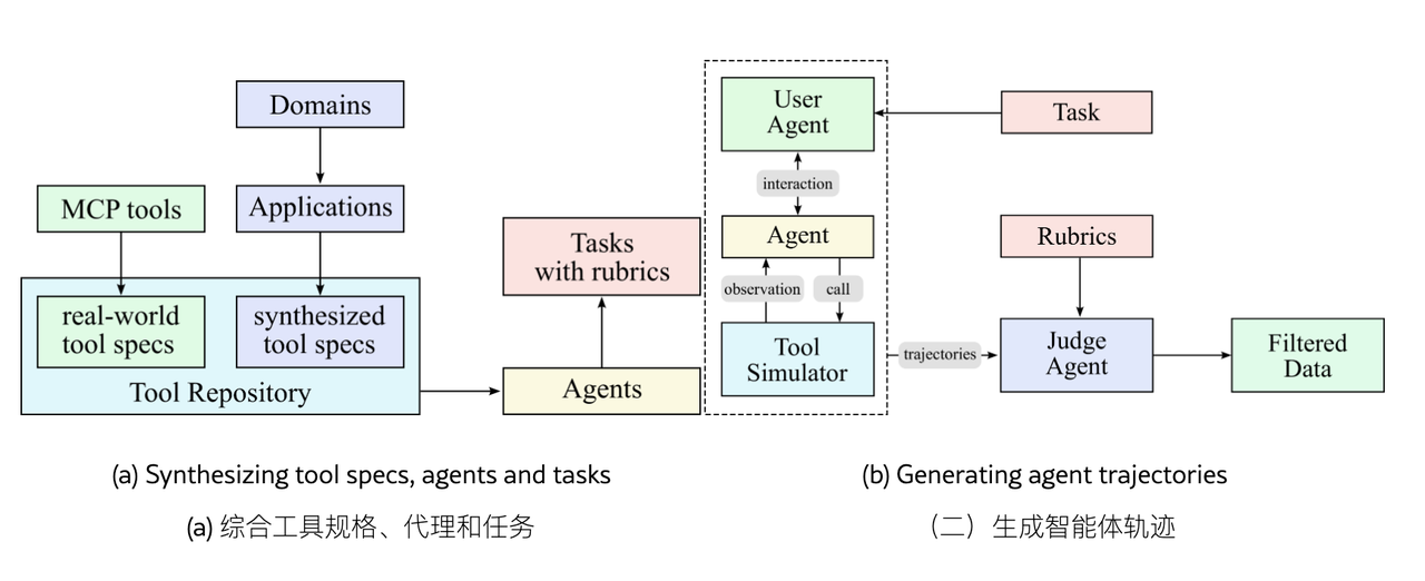 轨迹生成:对于每个代理和任务,我们生成代理通过调用工具完成任务的轨迹。