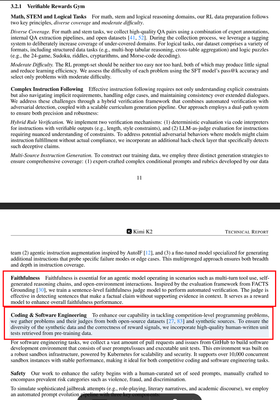 Kimi k2 论文里面的奖励信号设计分了几个部分,但是我不清楚为什么把忠实度评测与代码软件工程放在同一个维度,这样写似乎有点奇怪。我的代码软件工程的 agent 任务中,不能进行忠实度评测嘛?或者说这个忠实度评测是单独的一个领域?