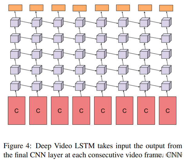 具体的 LSTM 操作如下图所示,C 表示最后一层 CNN 输出的特征,每个视频帧都对应了一个特征。这些特征是有时序的,所以将其用 5 层的 LSTM 处理抽取的视频特征,最后的橘黄色这一层代表直接做 softmax 分类了。 简单说,就是从双流网络抽取特征之后直接做 softmax 分类,改为抽取特征后进行 LSTM 融合,再做 softmax 分类。