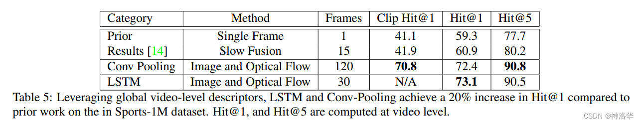 conv pooling 和 LSTM:都能处理非常多的视频帧,模型效果相比光流网络,稍有提升。