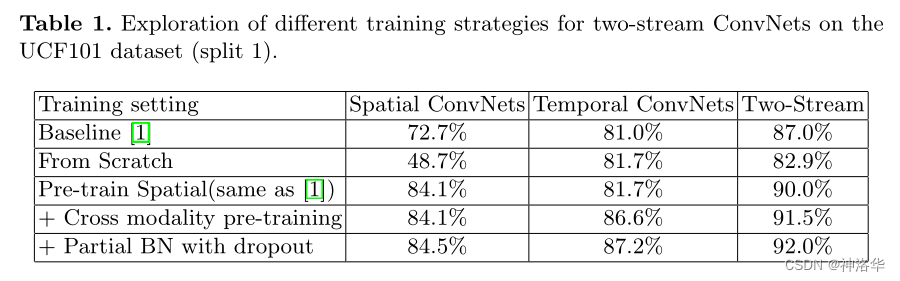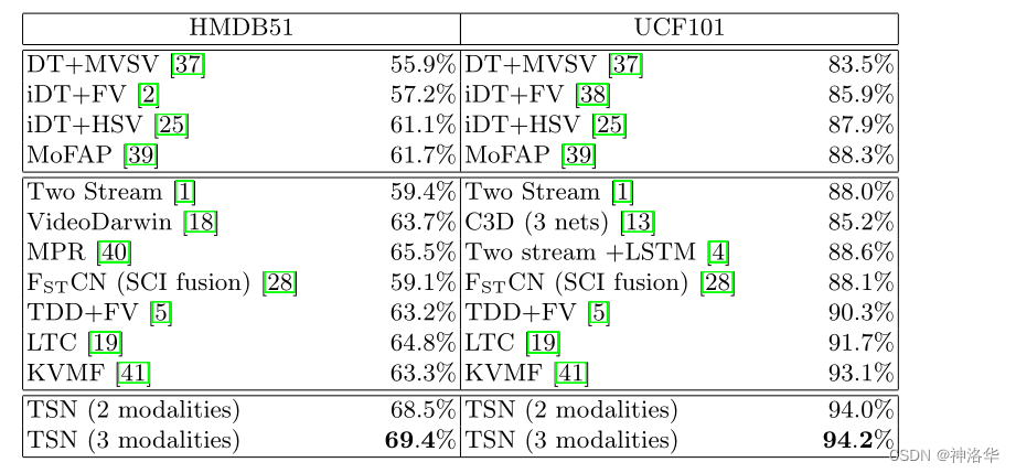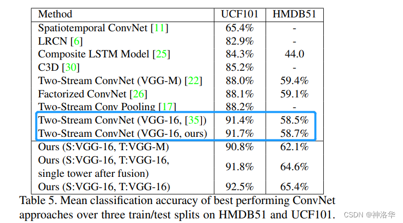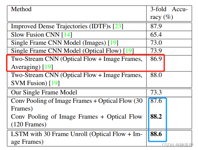 标蓝色的两个是作者用 VGG 复现了双流网络,因为使用了更深的 backbone,在