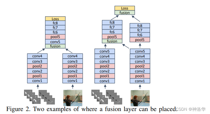双流网络叫 Two-Stream Convolutional Network ,这篇论文题目是将其颠倒了一下,但关键词是 Fusion。本文非常细致的讨论了如何去做双流网络特征的合并,主要是三个方向: