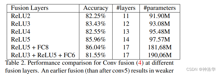 下面是试验结果,晚融合(relu5)和多融合(relu5+fc8)效果最好,但是多融合训练参数多一倍。