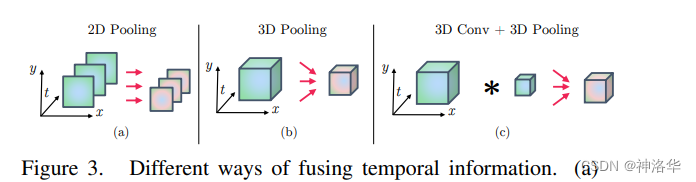 b:3D Pooling:先在时间维度堆叠各个特征图,再做 Pooling