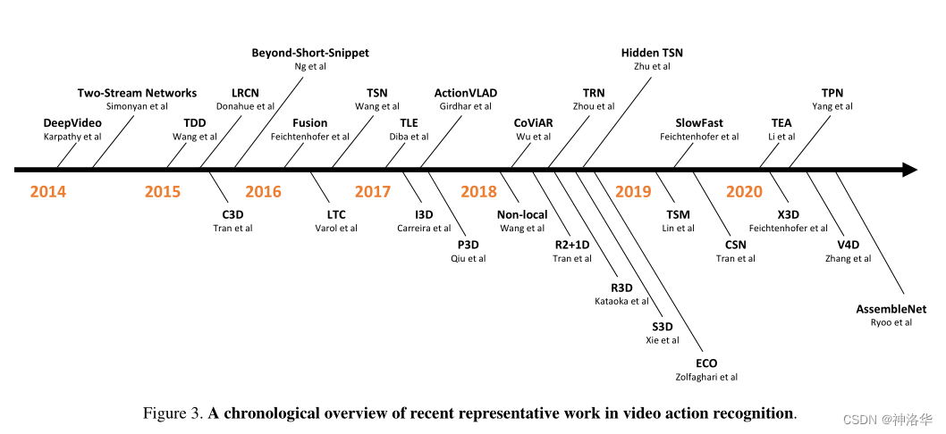 《A Comprehensive Study of Deep Video Action Recognition》 是 2020 年视频领域的一篇综述论文,总结了 VideoTransformer之前的约 200 篇用深度学习做视频理解的论文。本文基于此,讲解视频理解领域的发展。下图时间线概括了从早期卷积神经网络做视频理解的 DeepVideo,到双流网络及其变体、3D 网络及其变体的一系列过程。最后会讨论一下基于 Video Transformer 的工作。