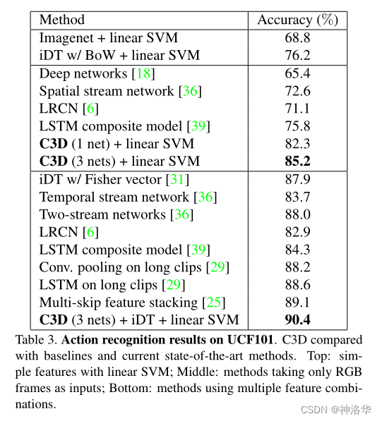 也就是说,在 UCF-101 这种只有六七秒的短视频上,LSTM 带来的提升非常有限。这也是可以理解的,因为 LSTM 操作,应该是一个更 high level,有更高语义信息的一种操作,其输入必须有一定的变化,才能起到应有的作用,才能学到时序上的改变。如果视频太短,可能其语义信息基本没有改变,对 LSTM 来说,各个时序上的输入基本都是一样的,所以它也学不到什么东西。如果是在长视频或者变化比较剧烈的视频上,LSTM 可能更有用武之地。
