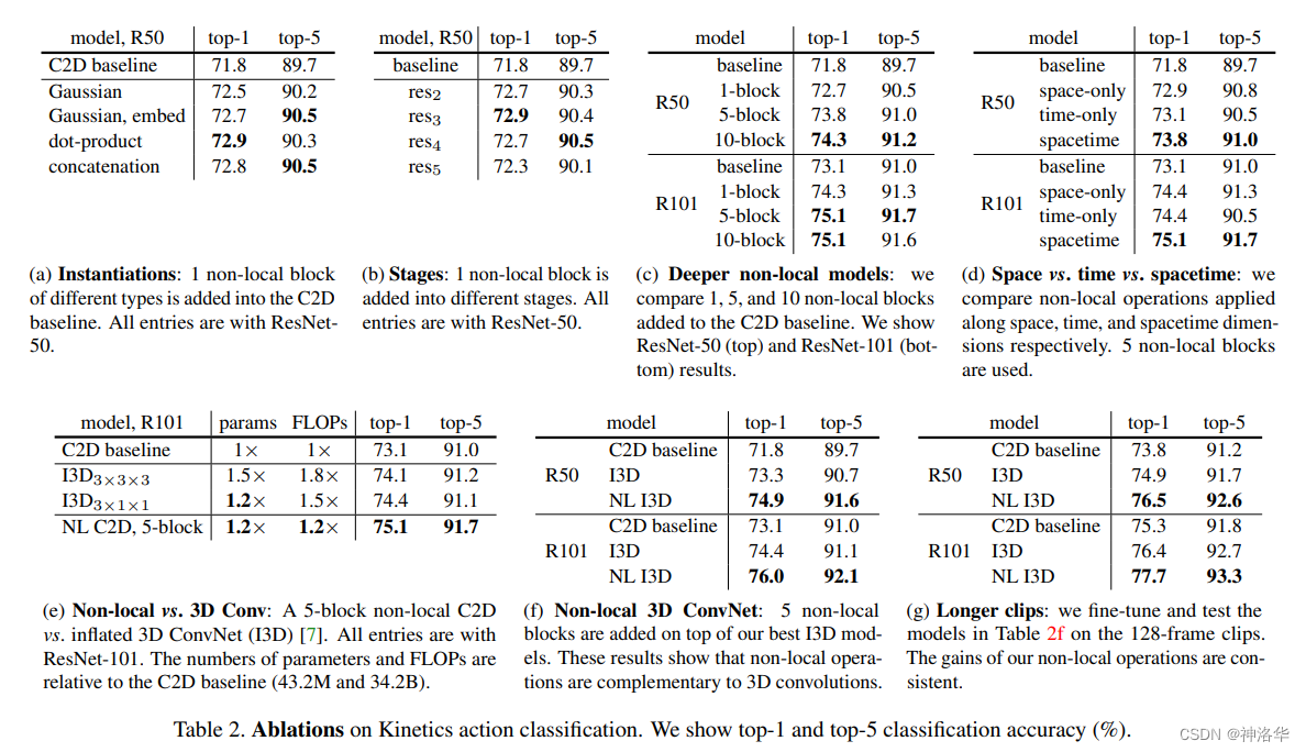 - 表 d 分别试验了只在时间维度和只在空间维度计算 self -attention,以及在时空维度计算 self attention 的结果,最终显示,时间维度做 self attention 效果优于空间维度,两个维度都做,效果最好。这也证明作者提出的