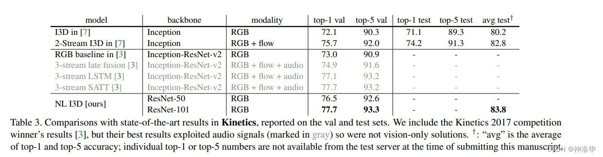 对比 Kinetics 上的视频分类结果(表 2)