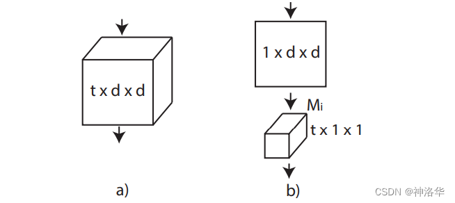 如上图所示, R(2+1)D 就是将一个 t×d×d 的卷积核,替换为一个 1×d×d 的卷积核和一个 t×1×1 的卷积核。也就是先只在空间维度(宽高尺度)上做卷积,时间维度卷积尺寸保持为 1 不变;然后再保持空间维度不变,只做时间维度的卷积。