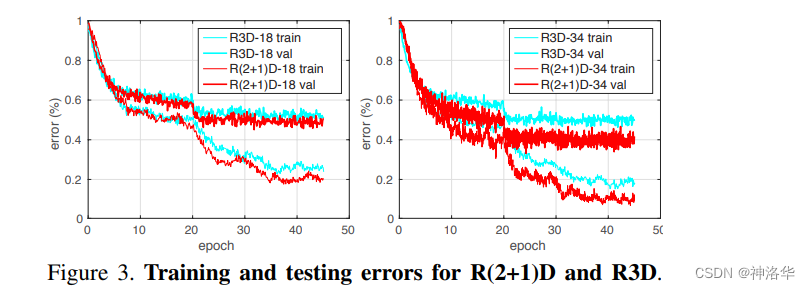 R(2+1)D结构使网络更加容易优化 :直接使用 3D 卷积,模型是不容易学习的,拆分成两次卷积之后,降低了模型学习的难度。在参数量相同的情况下,R(2+1)D获得的训练损失和测试损失更低。网络层数越深,效果差距越明显。 下面是两种结构的训练和测试误差对比图,R(2+1)D网络误差都更小,这既不是过拟合也不是欠拟合,而确实是网络更容易训练。