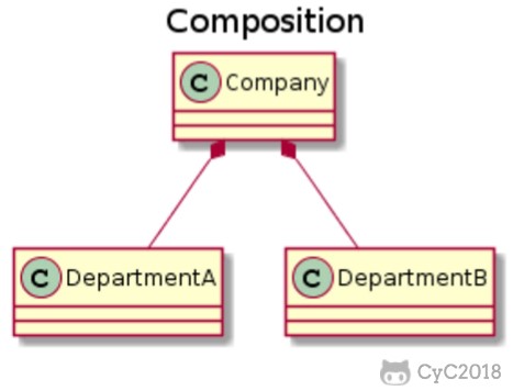 和聚合不同,组合中整体和部分是强依赖的,整体不存在了部分也不存在了 。比如公司和部门,公司没了部门就不存在了。但是公司和员工就属于聚合关系了,因为公司没了员工还在。