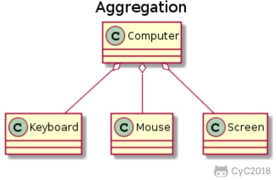 表示整体由部分组成,但是整体和部分不是强依赖的,整体不存在了部分还是会存在。