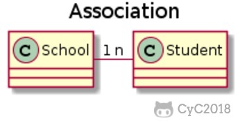 表示不同类对象之间有关联,这是一种静态关系,与运行过程的状态无关,在最开始就可以确定。因此也可以用 1 对 1、多对 1、多对多这种关联关系来表示。比如学生和学校就是一种关联关系,一个学校可以有很多学生,但是一个学生只属于一个学校,因此这是一种多对一的关系,在运行开始之前就可以确定。