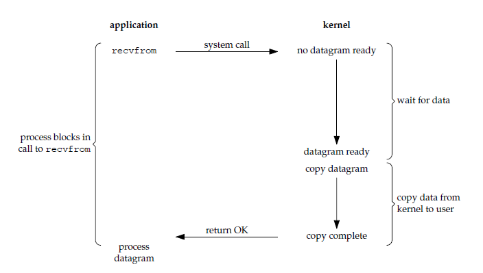 对于一个套接字上的输入操作,第一步通常涉及等待数据从网络中到达。当所等待数据到达时,它被复制到内核中的某个缓冲区。第二步就是把数据从内核缓冲区复制到应用进程缓冲区。