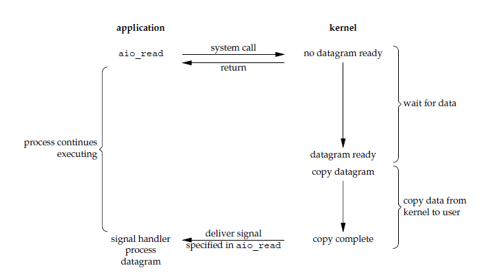 应用进程执行 aio_read 系统调用会立即返回,应用进程可以继续执行,不会被阻塞,内核会在所有操作完成之后向应用进程发送信号。