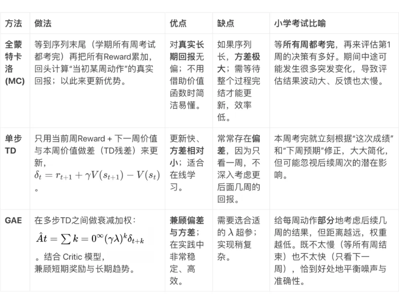 GAE(Generalized Advantage Estimation)就像一个“在单步 TD 与全局蒙特卡洛之间”找折衷的办法——用参数来控制“我们想考察多少步以后的反馈”。