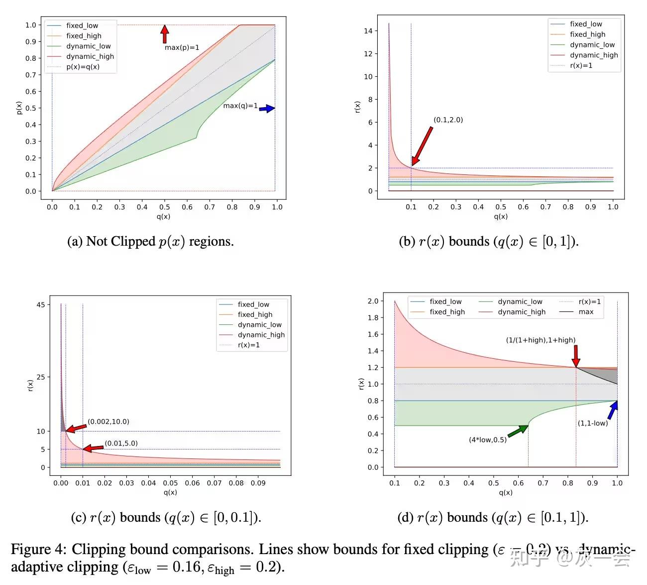 4. CLIP(Dynamic-Adaptive Clipping): 从动态采样方差的偏差出发,推到出对应不同概率的上下限范围,使 clip 剪切范围随着概率的变化成反比变化,在低旧概率时,可参与模型训练的新概率范围越大,这对模型在低概率高熵域有极大的探索空间。即有理论支持,同时更符合实际使用意义。具体推到可参考 LLMs-RL 中 off-policy 为什么要 clip 以及常见变体?(PPO\GRPO\DAPO\DC...零梯度、零剪枝!DCPO 带你玩转强化学习。 【token 维度,动态区间,更好学习 rare token 的信息】