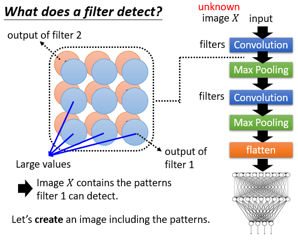 我们就去製造出一张图片,它不是我们的 Database 裡面,任何一个特定的图片,而是机器自己去找出来的,自己创造出来的,我们要创造一张图片,这张图片它包含有 Filter 1 要 Detect 的 Pattern,那藉由看这张图片裡面的内容,我们就可以知道 Filter 1,它负责 Detect 什麼样的东西