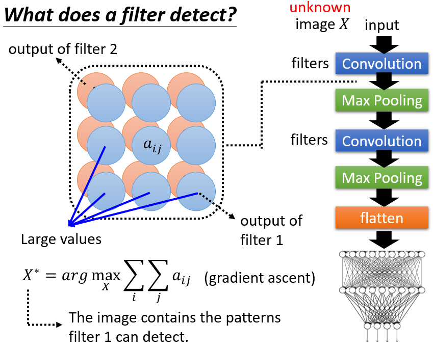但是现在我们要做的是 Global 的 Explanation,也就是我们还没有这张图片 Image X,我们没有要针对任何一张特定的图片做分析,但是我们现在想要知道说,对 Filter 1 而言,它想要看的 Pattern 到底长什麼样子,那怎麼做呢