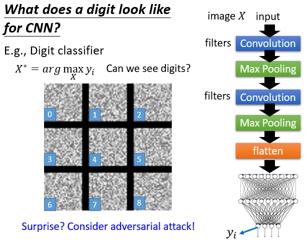 那这个结果,假设我们还没有教 Adversarial Attack,你可能会觉得好神奇,怎麼会这个样子,机器看到一堆是杂讯的东西,它以為它看到数字吗,怎麼会这麼愚蠢,但是因為我们已经教过 Adversarial Attack,所以想必你其实不会太震惊,因為我们在做 Adversarial Attack 的时候,我们就已经告诉你说,在 Image 上面加上一些,人眼根本看不到的奇奇怪怪的杂讯,就可以让机器看到各式各样的物件