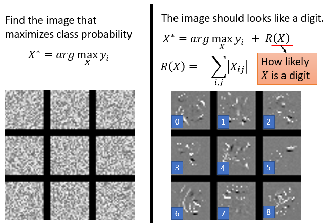 那像今天这个例子,今天这个手写数字辨识的例子,你单纯只是找说,我要找一张 Image,让对应到某一个数字的信心分数越高越好,你单纯只做这件事情,你找到了只会是一堆杂讯,怎麼办呢