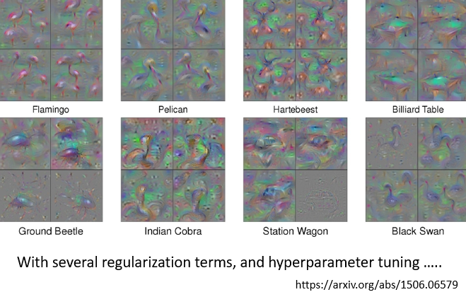 但是你要得到这样子的图片,其实没有你想像的那麼容易,你如果仔细去看这个文献的话,你就会发现说,要得到这些图片,你必须要下非常多的 Constraint,你要根据你对影像的了解,一个 Object 长什麼样子的了解,下非常多的限制,再加上一大堆的 Hyperparameter Tuning,你知道我们解 Optimization Problem 的时候,也是需要这个调这个 Hyperparameter,比如说 Learning rate 之类的,所以下一堆 Constraint,调一堆参数,你才可以得出这样的结果,所以这样的结果并不是随随便便,就可以轻易的做出来的