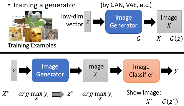 那我们刚才也看到说光这麼做,你往往做不出什麼特别厉害的结果,现在有了 Image Generator 以后,方法就不一样了,我们现在不是去找 X,而是去找一个 z,我们要找一个 z,这个 z 通过 Image Generator 產生 X,再把这个 X 丢到 Image classifier,去產生 y 以后,希望 y 裡面对应的某一个类别,它的分数越大越好