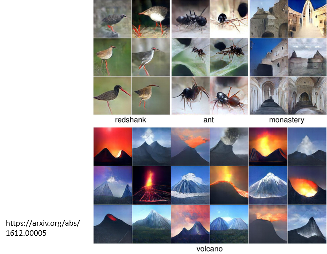 假设你今天想要產生,比如说这个让蚂蚁分数,让蚂蚁的信心分数最高的 Image,那產生出来的蚂蚁的照片,这个很厉害,这个长得是这个样子,都看得出这个就是蚂蚁,或者是要让机器產生火山的照片,產生一堆照片,丢到 Classifier 以后,火山的信心分数特别高的,那确实可以找出一堆 Image,这些 Image 一看就知道像是火山一样