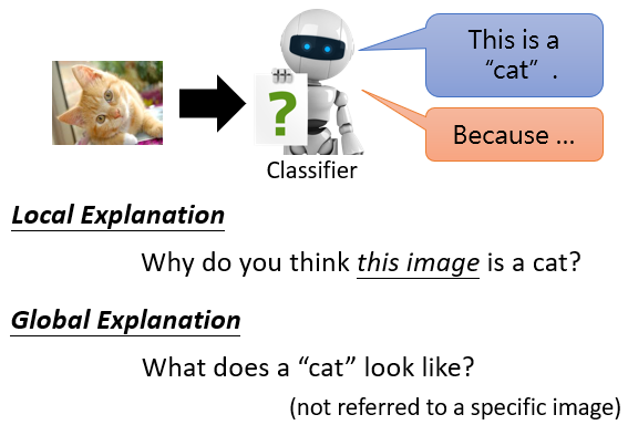 Global 的 Explanation 是什麼意思呢,我们在前一堂课讲的是 Local 的 Explanation,也就是给机器一张照片,那它告诉我们说,看到这张图片,它為什麼觉得裡面有一隻猫