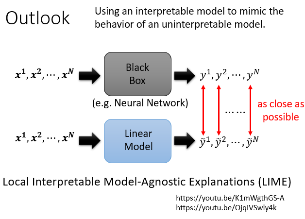 那像这种方法,它也没有说,它要用 Linear Model 去模仿黑盒子全部的行為,它有特别开宗明义在名字裡面就告诉你说,它是 Local Interpretable,也就是它只要 Linear Model 去模仿这个黑盒子,在一小个区域内的行為,因為 Linear Model 能力有限,它不可能模仿整个 Neural Network 的行為,但也许让它模仿一小个区域的行為,那我们就解读那一小个区域裡面发生的事情,那这个是一个非常经典的方法,叫做 LIME,如果你想知道 LIME 是什麼的话,你可以看以下的录影,那今天呢 我们就不再细讲,那在作业裡面,我们也有有关 LIME 的作业,那这个部分就是留给大家,自己去阅读文献,自己去感受这个 LIME 是在做什麼,好 那这个部分呢,就是有关 Explainable Machine Learning 的简介