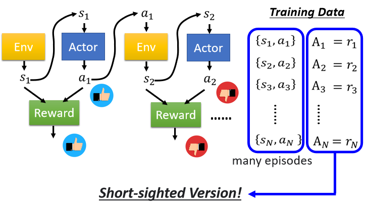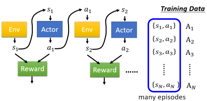 所以我们就是去观察,某一个 Actor 它跟环境互动的状况,那把这个 Actor,它在每一个 Observation,执行的 Action 都记录下来,然后接下来,我们就去评价每一个 Action,它到底是好还是不好,评价完以后,我们就可以拿我们评价的结果,来训练我们的 Actor