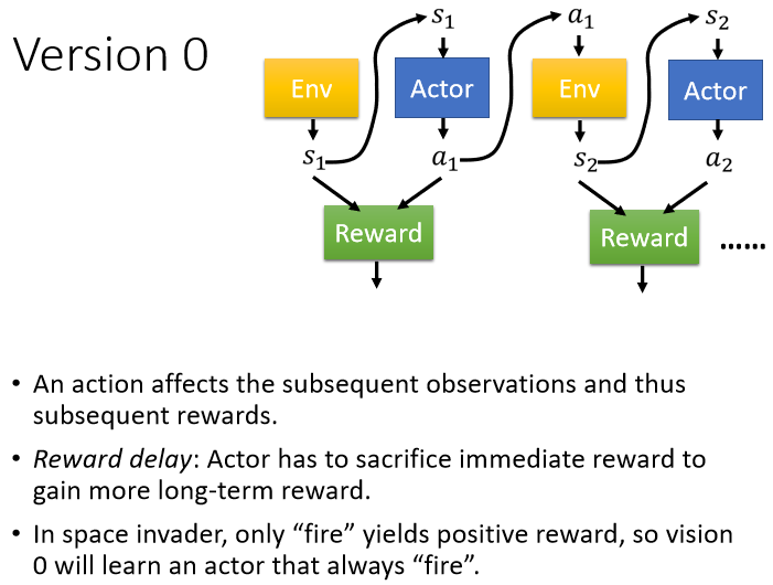 那这个,那这个 Version 0,它并不是一个好的版本,为什么它不是一个好的版本呢,因为你用这一个方法,你把 设为 ,A2 设为 ,这个方法认出来的 Network,它是一个短视近利的 Actor,它就是一个只知道会一时爽的 Actor,它完全没有长程规划的概念