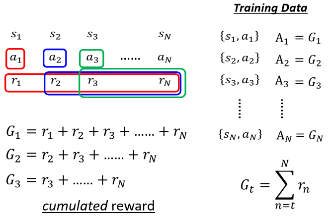 那我们就把这个 Reward ,当做是 a, 就是 ,A2 就是 ,A3 就是 ,AN 就是 ,那这样等同于你就告诉 machine 说,如果我们执行完某一个 Action, 那得到的 Reward 是正的,那这就是一个好的 Action,你以后看到 就要执行 ,如果今天在 执行 a2,得到 Reward 是负的,就代表 a2 是不好的 a2,就代表所以以后看到 的时候,就不要执行 a2