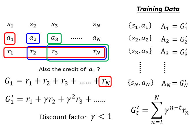 A3: 对 没错 是,在这个设计的情境裡面,是,越早的动作就会累积到越多的分数,但是这个其实也是一个合理的情境,因为你想想看,比较早的那些动作对接下来的影响比较大,到游戏的终局,没什么外星人可以杀了,你可能做 什么事对结果影响都不大,所以比较早的那些 Observation,它们的动作是我们可能需要特别在意的,不过像这种 A 要怎么决定,有很多种不同的方法,如果你不想要比较早的动作 Action 比较大,你完全可以改变这个 A 的定义,事实上不同的 rl 的方法,其实就是在 A 上面下文章,有不同的定义 A 的方法