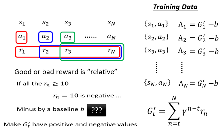 所以如果我们只是单纯的把 G 算出来,你可能会遇到一个问题,假设这个游戏裡面,可能永远都是拿到正的分数,每一个行为都会给我们正的分数,只是有大有小的不同,那你这边 G 算出来通通都会是正的,有些行为其实是不好的,但是你 仍然会鼓励你的 Model,去採取这些行为