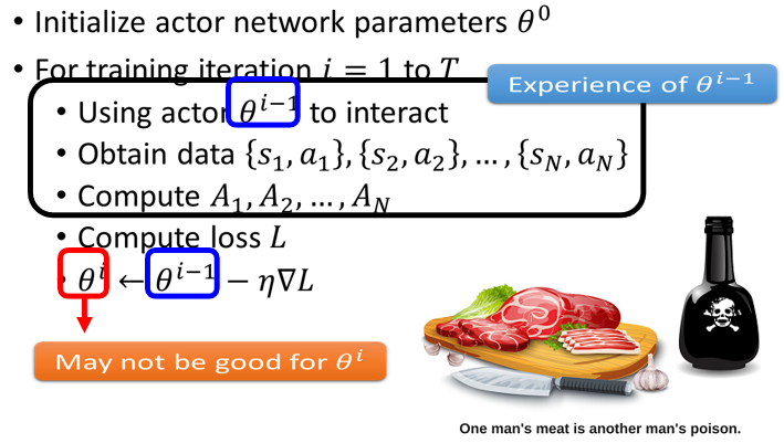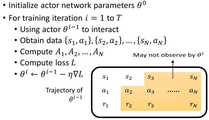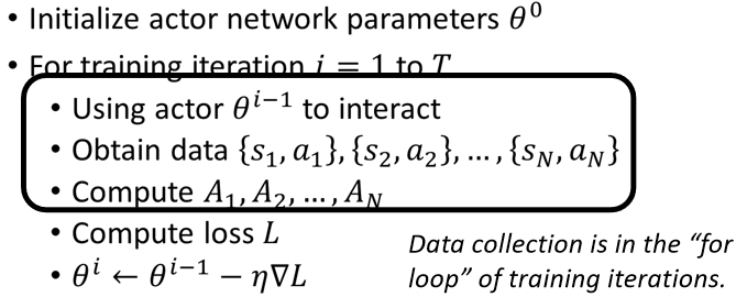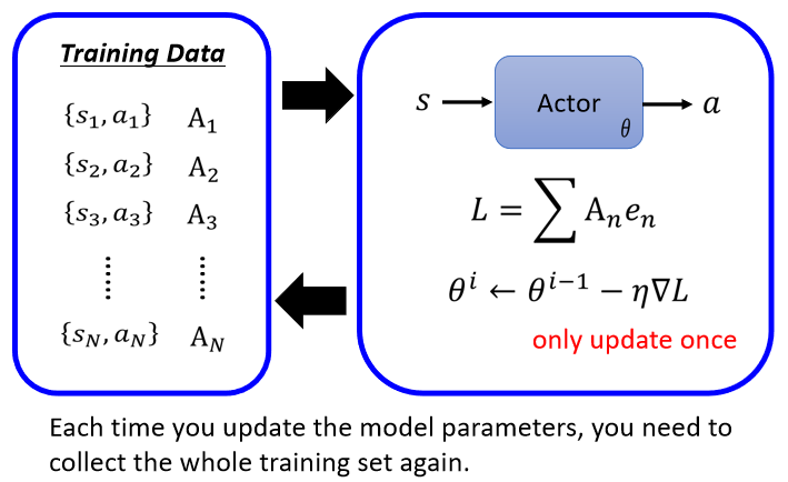所以今天我们在收集资料,来训练你的 Actor 的时候,你要注意就是收集资料的那个 Actor,要跟被训练的那个 Actor,最好就是同一个,那当你的 Actor 更新以后,你就最好要重新去收集资料,这就是为什么 RL它非常花时间的原因